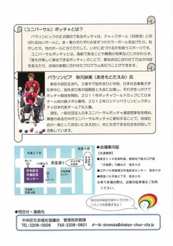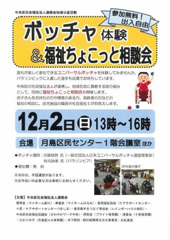 12月2日(日)13時~16時、月島区民センター1階会議室でユニバーサルボッチャの体験と福祉ちょこっと相談会(参加費無料)を行います。中央区以外の在住者・在勤者の方も参加可能です。ぜひ、足を運んでみてください。