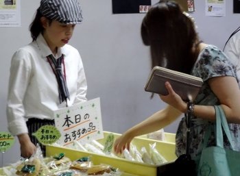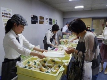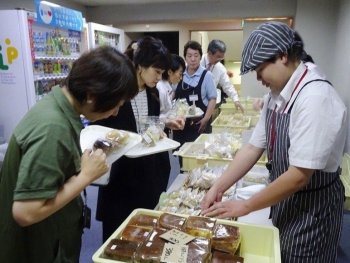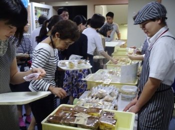アスタ荏田は、障がい者も健常者も共にくらしやすい所をつくりたいとの理念で設立され、菓子製造・販売や喫茶を通じて、地域をはじめとする社会と接しながら活動を行っており、丸紅基金が第36回(2010年)に業務用冷蔵ショーケースを助成した団体です。おいしそうなパンやシフォンケーキは飛ぶように売れ、目玉のプリンは即完売となる盛況ぶりでした。